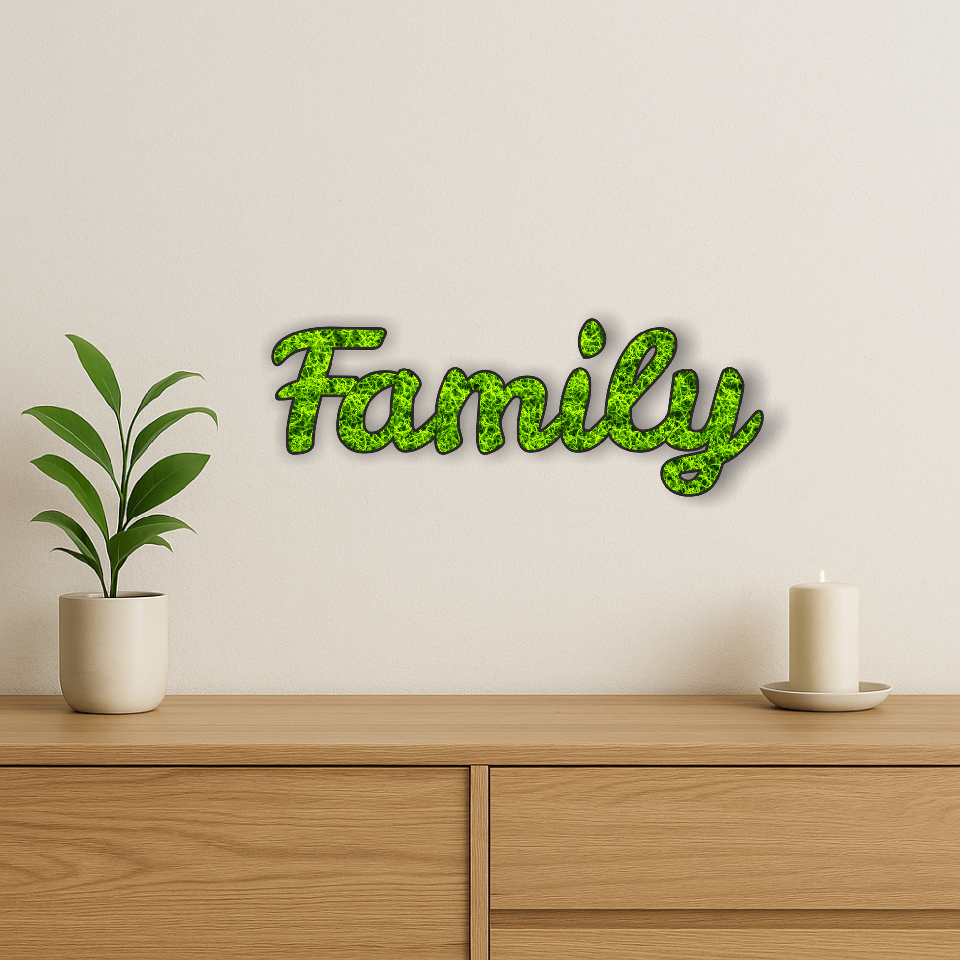 Der Moos-Schriftzug „Family“ strahlt eine liebevolle, einladende Atmosphäre aus und verbindet modernes Design mit lebendiger Naturdeko.