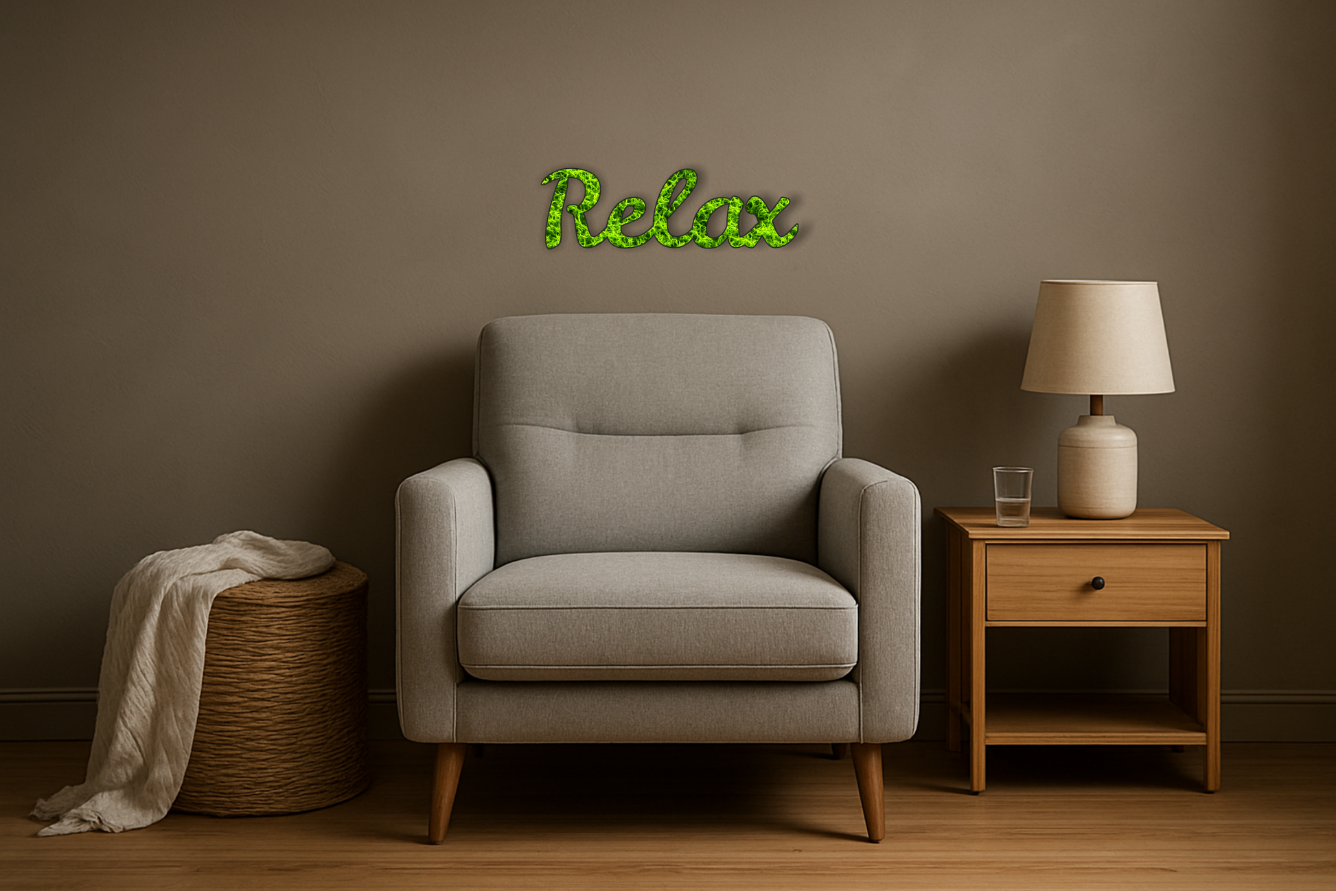 Der Moos-Schriftzug „Relax“ eignet sich ideal als Geschenk für Freunde, Wellness-Fans oder für alle, die eine entspannte Atmosphäre lieben. Perfekt für Badezimmer, Spa-Bereiche oder kuschelige Wohlfühlorte.